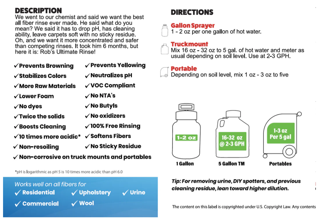 Directions For best results, create a solution with hot water (not to exceed 145 degrees) and use within 2 hours. The solution may also be combined with other cleaning chemicals to boost cleaning power and to treat dark stains caused by coffee, tea, ground-in dirt, or dark juices. TruckMounts: 1 scoop per 5 gallons (booster) Fringe Cleaner: Add 1/2 ounce per quart of water, 15 min dwell time and rinse Urine Prespray: 2-3 scoops per gallon (Extract with wand, rotary or preferably subsurface extraction tool.) ~ ALWAYS TEST FOR COLORFASTNESS ~